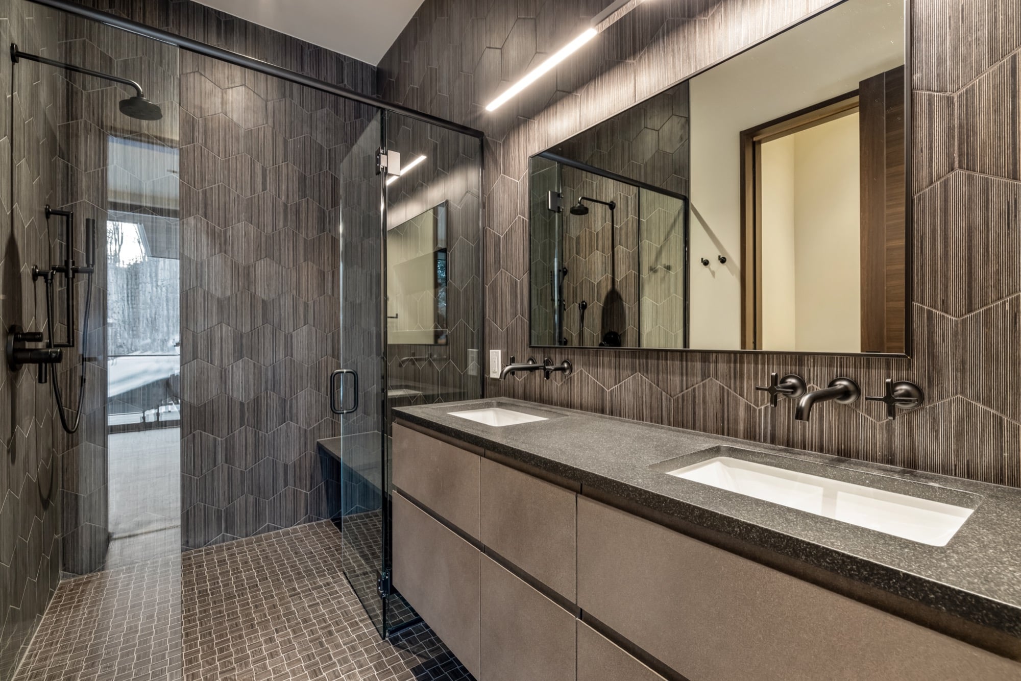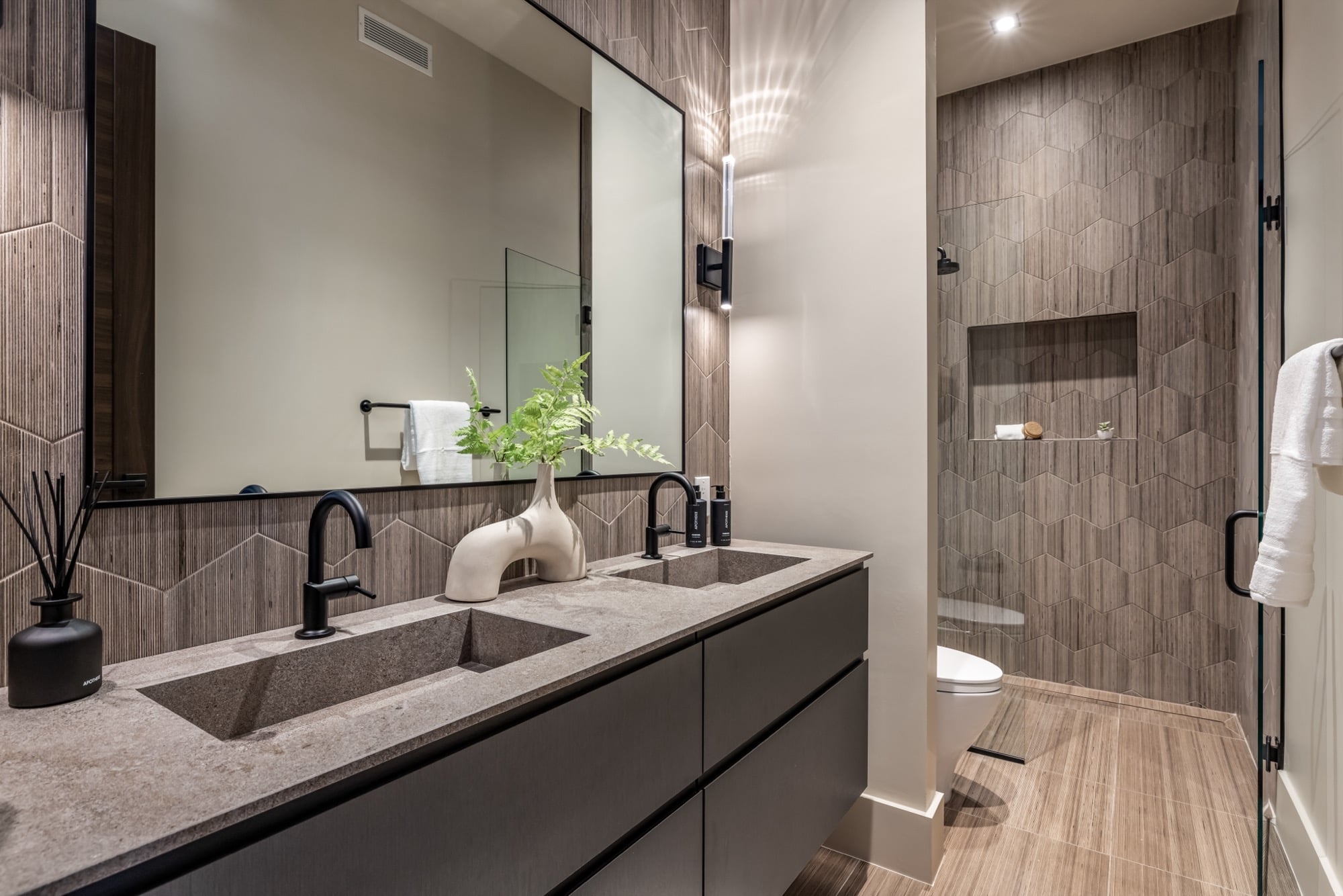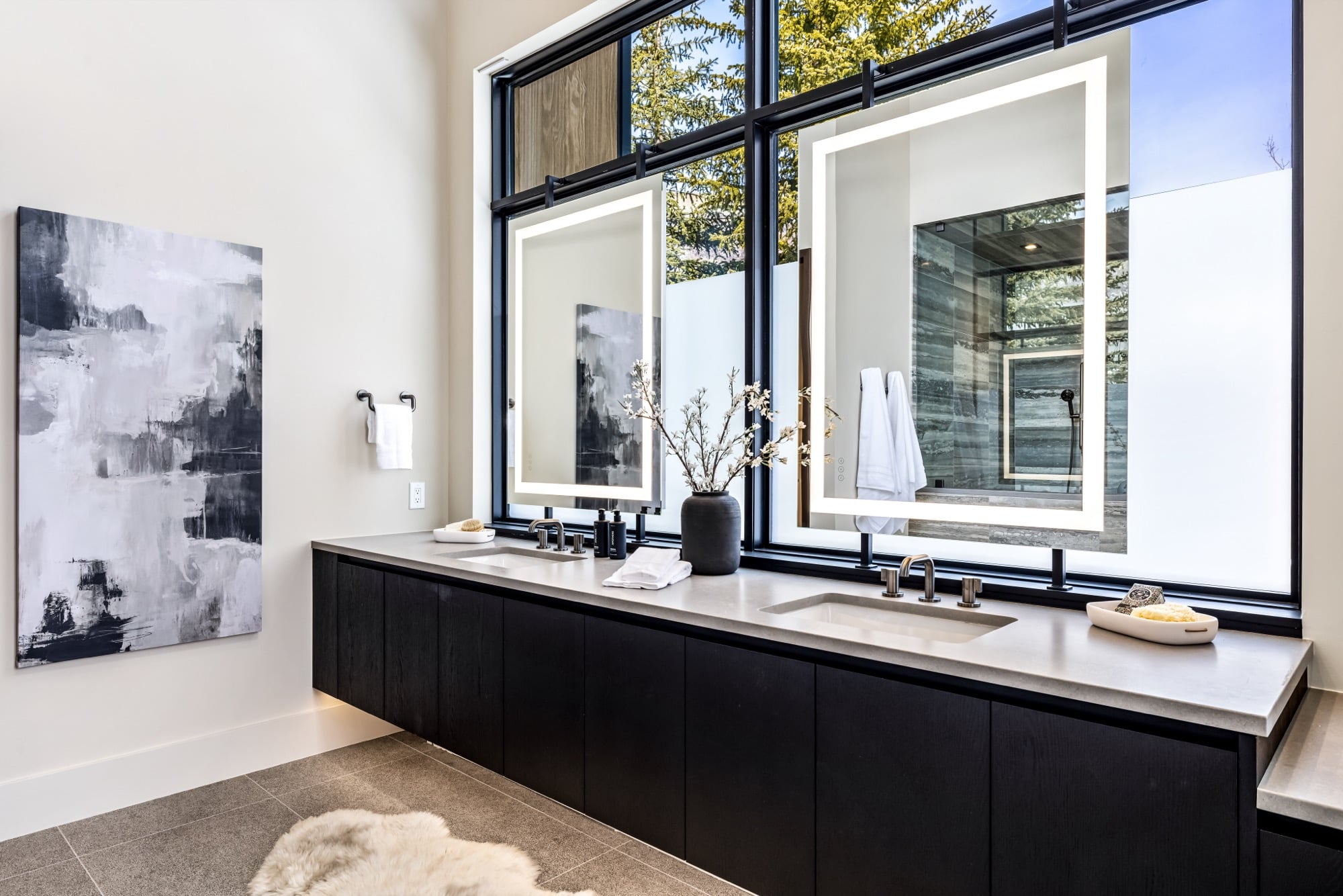 - Spa-Like Bathroom: A four-piece design with natural slab stone finishes and forest views, creating a tranquil, luxurious atmosphere