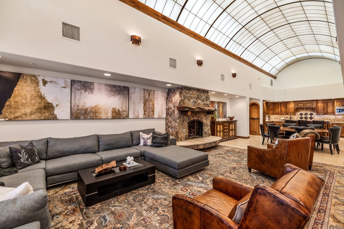The expansive great room features soaring ceilings, an open-concept layout, a stone gas fireplace, a generous dining area, and a kitchen with an island and breakfast bar, ideal for entertaining or everyday relaxed living. A separate media and lounge room adds flexibility, while a striking loft with custom steel railing and ladder creates a unique hangout or overflow sleeping space.