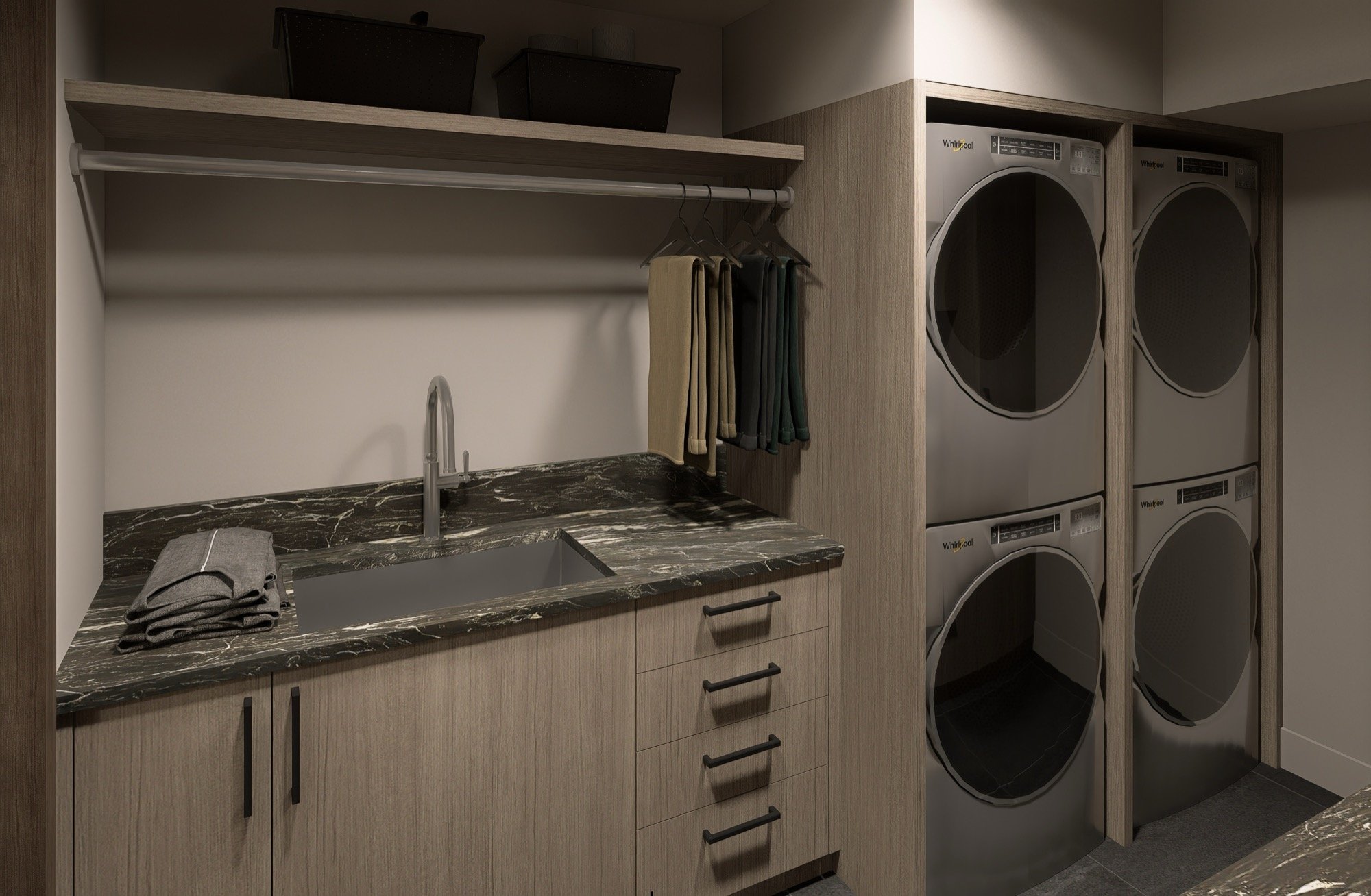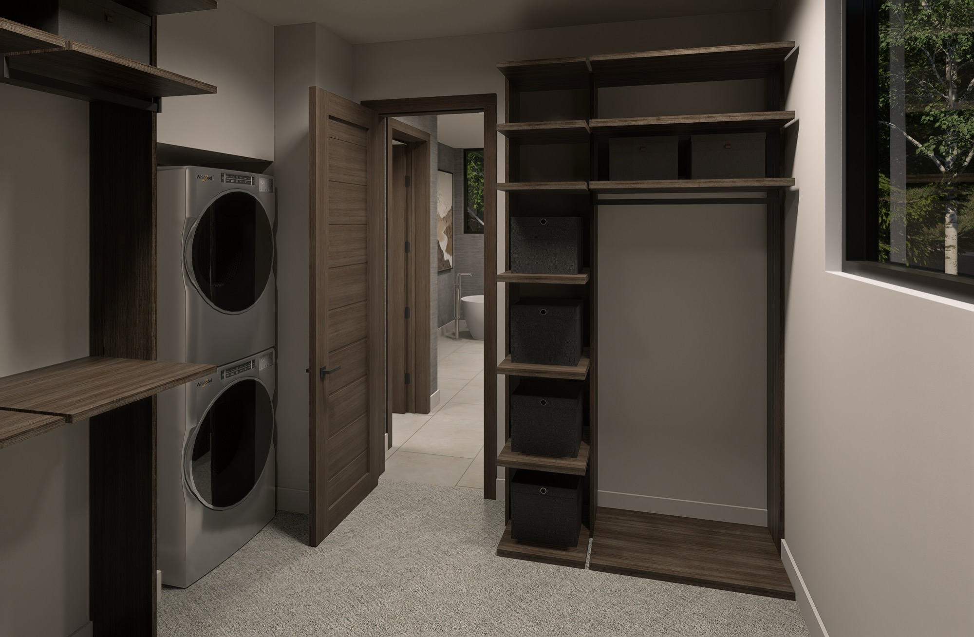 - Sun-drenched & main-level primary suite with floor-to-ceiling fireplace, custom cabinetry throughout, & designated space for a washer & dryer in the closet
