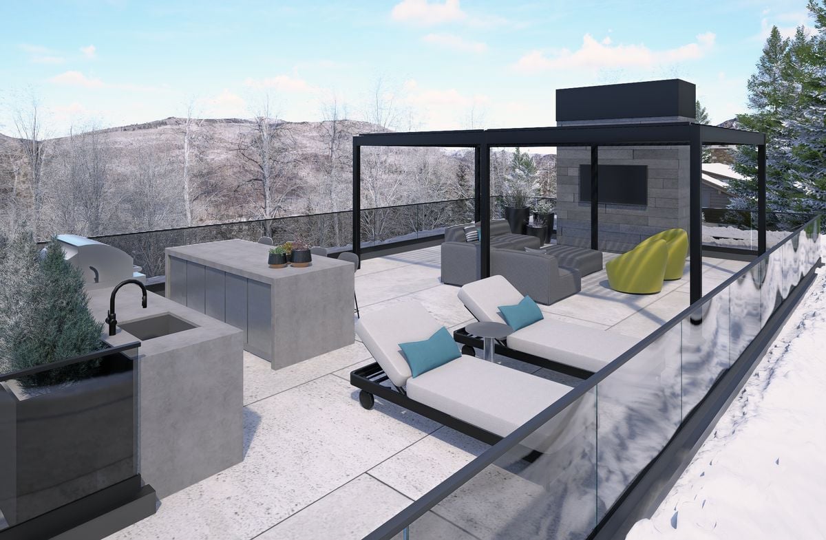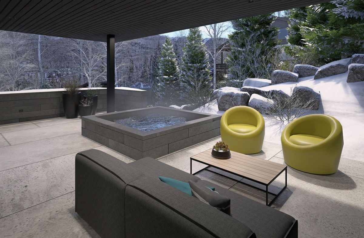 The residence offers approximately 3,438 square feet of fully heated outdoor living space designed for true four-season enjoyment. Multiple terraces and gathering areas span every level, culminating in a nearly 1,000-square-foot rooftop deck overlooking the Gore Range and Vail Village, offering prime views of skiers descending Vail Mountain. A private hot tub is thoughtfully positioned for relaxation after skiing while still capturing mountain light and views.