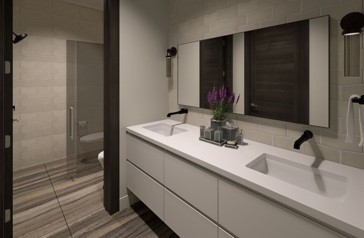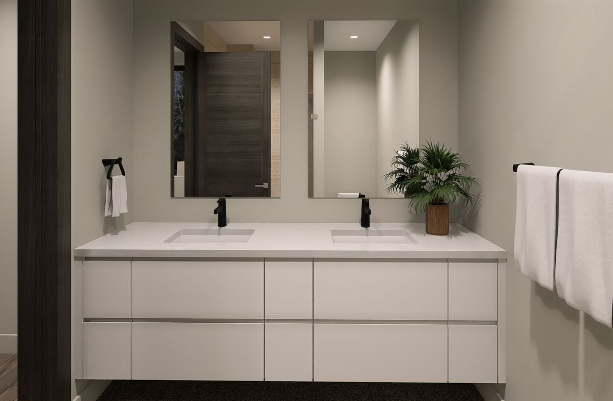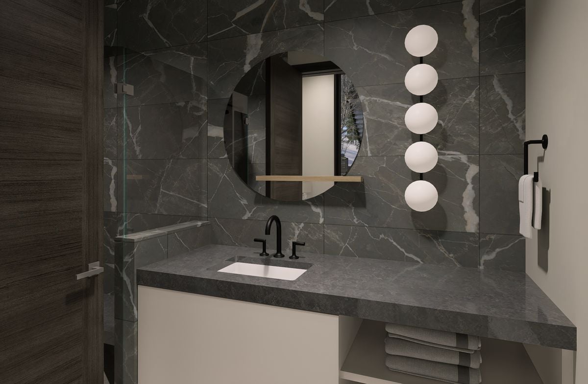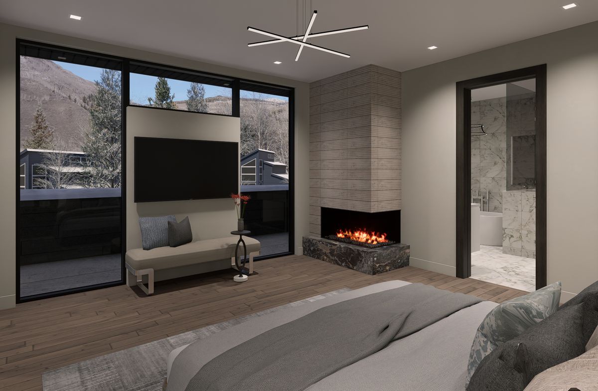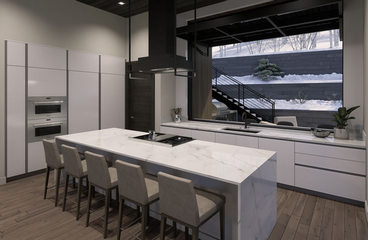 The main level is anchored by an open-concept great room with a fireplace, sculptural lighting, and expansive glass that draws natural light inward while maintaining privacy and connection to the ski environment. The chef’s kitchen balances performance and design with custom Italian cabinetry, Calacatta-inspired slab countertops, and a handcrafted Raw Urth steel range hood that serves as a sculptural focal point. Sub-Zero, Wolf, and Cove appliances are seamlessly integrated throughout.