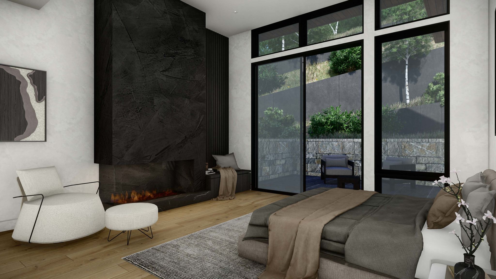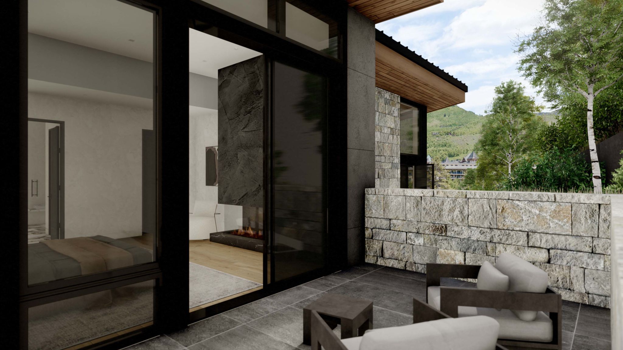 - Interior Finishes: Natural slab stone in bathrooms and fireplaces for elegance and texture