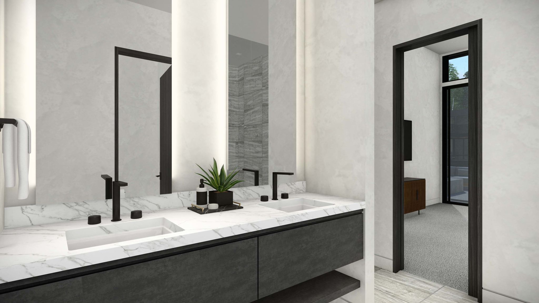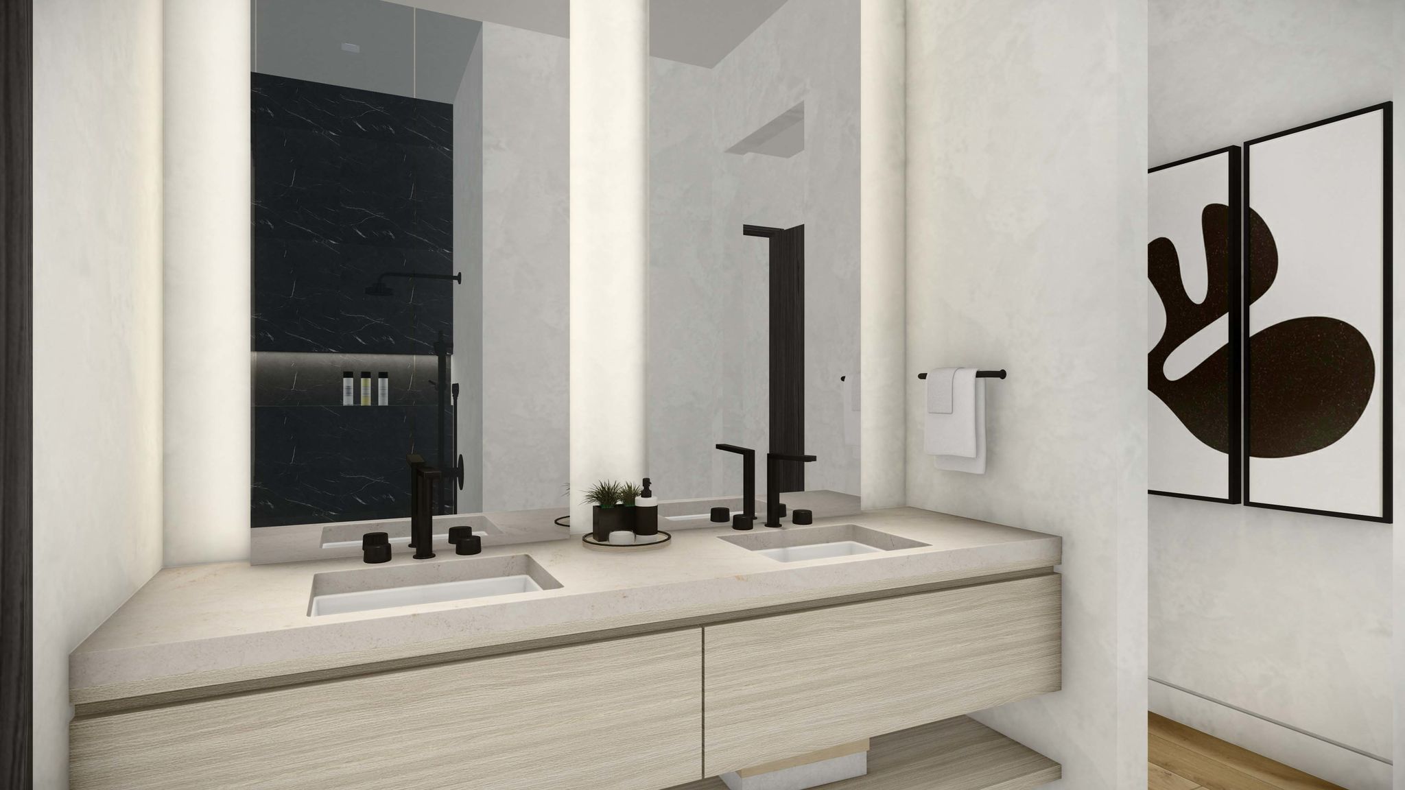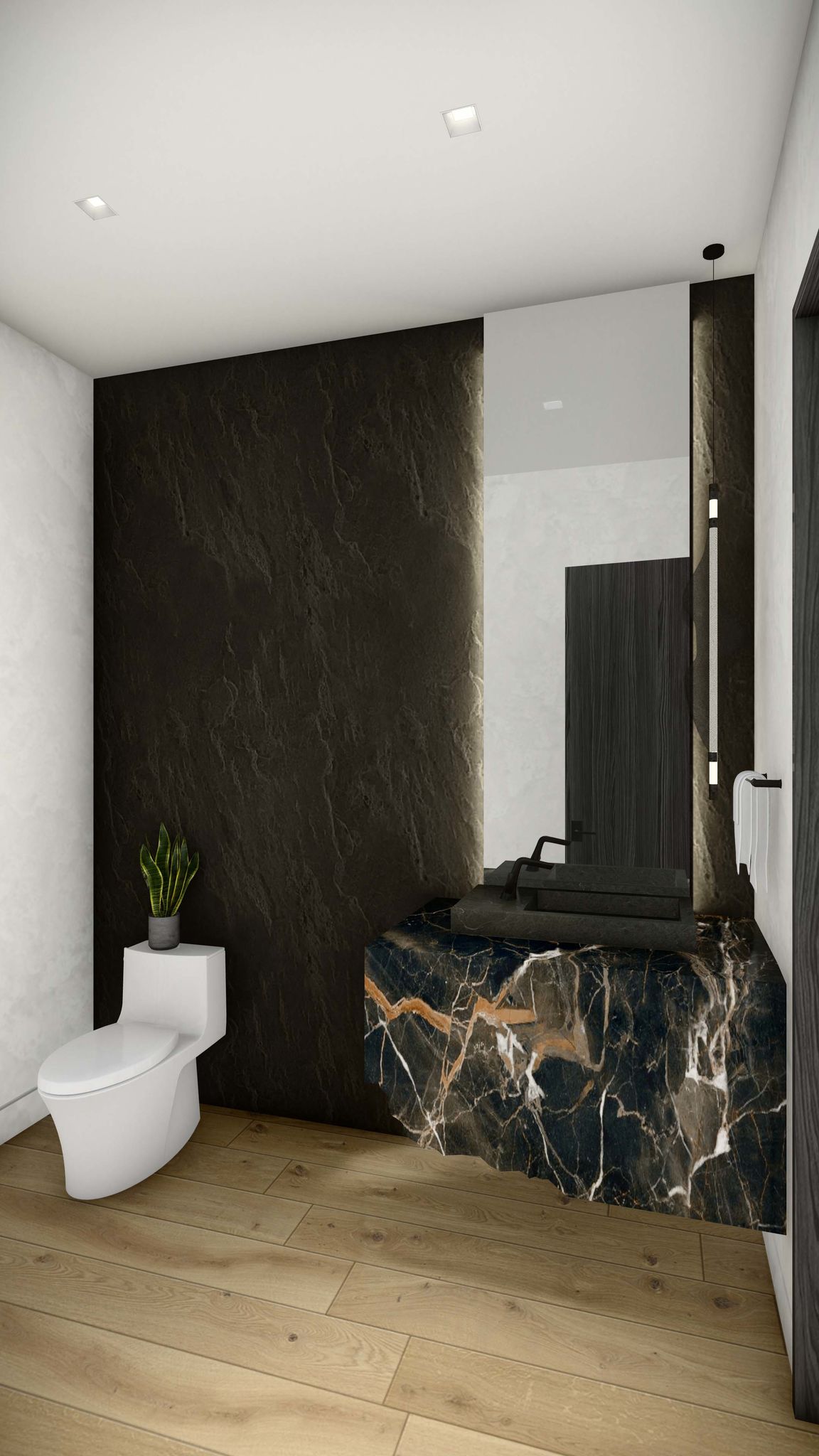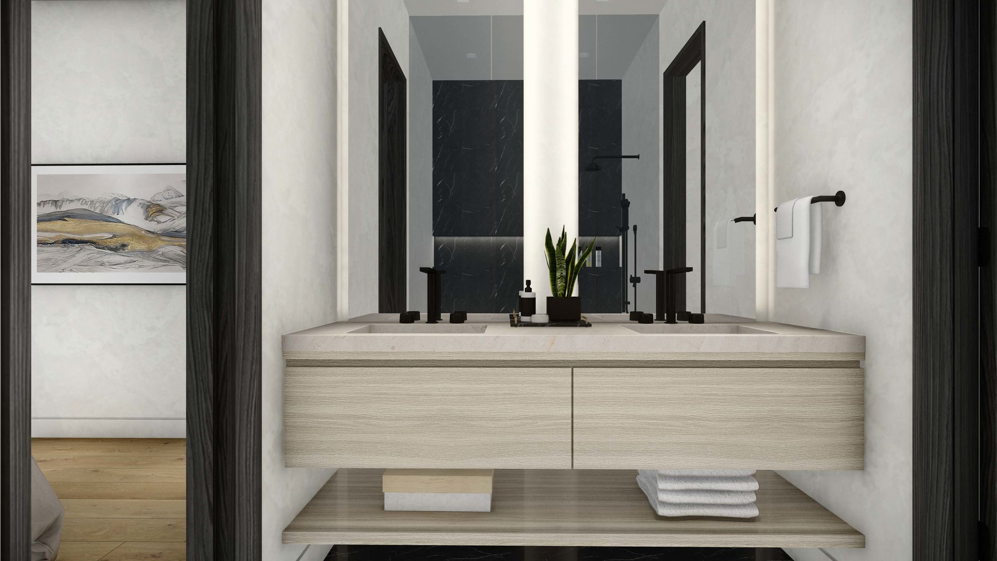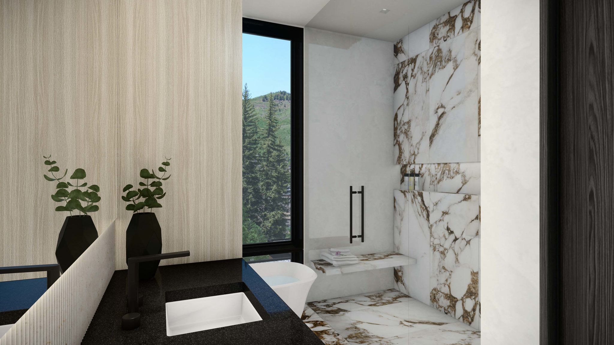 - Spa-inspired bathroom with natural slab stone finishes